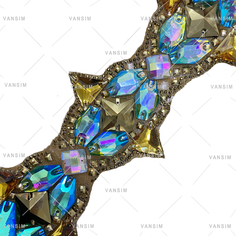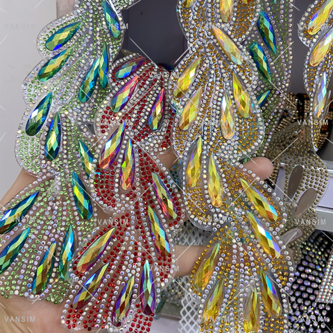 手作りのカスタマイズされた反射カーニバルコスチューム樹脂ビーズホットフィックスストーンアップリケパッチトリムフィエスタパーティー用トリミング付き